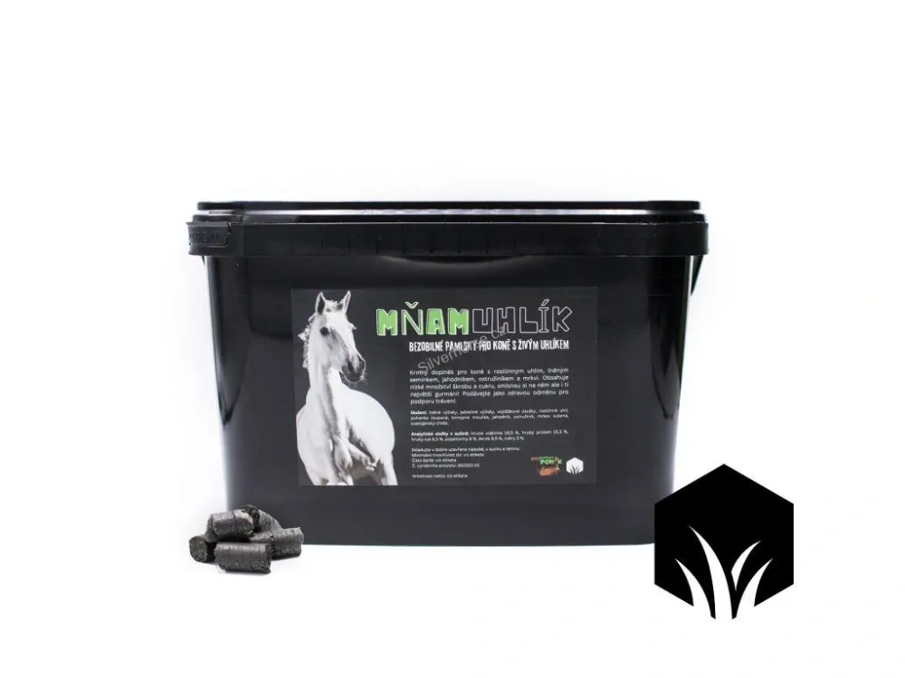 MňamUhlík je bezobilný krmný doplněk pro koně - pamlsek - s Živým Uhlíkem, založený na lněném semínku, jablečných výliscích a vojtěšce. Do receptury jsme navíc přidali i konopné semínko, ostružiník, maliník, pohanku, karob a mrkev. MňamUhlík je mlska s nízkým obsahem škrobu a cukrů, kterou můžete podávat jako odměnu nebo jen tak pro podporu trávicího traktu Vašeho koňského parťáka. Pamlsek není tvrdý a dobře se kouše, má formu válečků o průměru 10 mm.
